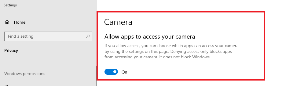 In Microsoft Windows Camera Privacy Settings (Settings\Privacy\Camera), enable the "Allow apps to access your camera" option.