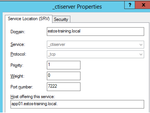 Example screenshot: _ctiserver Properties - Service Location (SRV)