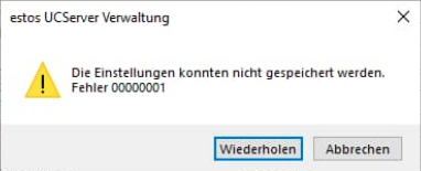 Example screenshot: Error message from estos UCServer administration: The settings could not be saved. Error 00000001