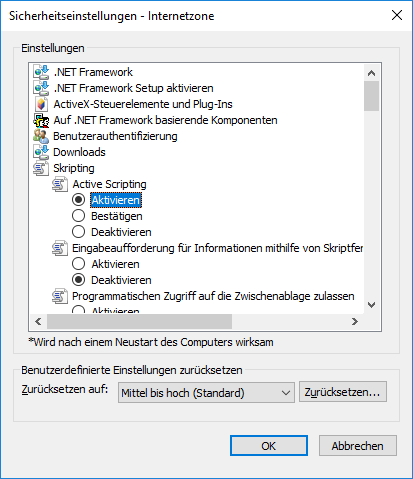 Recognize the page ecticlient.estos.de as intranet page and activate Active Scripting.