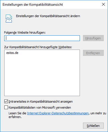 The page http://ecticlient.estos.de/ or estos.de, in general, has been marked as an intranet page with Compatibility View enabled.