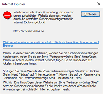 The page http://ecticlient.estos.de/ or estos.de, in general, has been detected in a security zone (normally this will be the internet zone) where Active Scripting is disabled or needs to be confirmed.