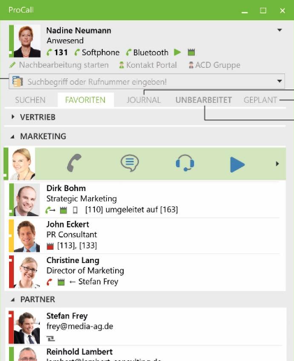 Until ProCall 6 Enterprise, it was possible to distinguish between internal and external calls based on the colour of the telephone receiver icon (idle state black, internal call yellow, external call red), but this is no longer possible in newer versions.