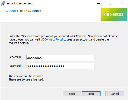 If the ProCall Enterprise Server Setup is executed and the estos UCConnect ServerID and the corresponding password are entered, the licence and contract check is carried out in estos UCConnect with the entered login data.