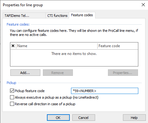 Allows the configuration of a facility code to perform a pickup if the driver of the telephone system does not offer this via TAPI. Primarily it is tried to realize a pickup via TAPI. If this fails, the facility code stored here is used.