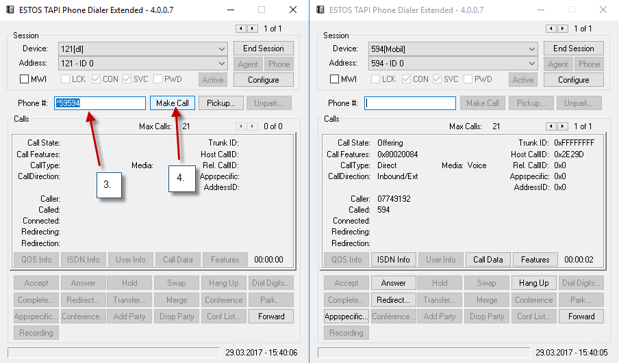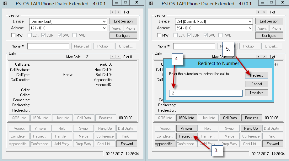 - Click on the "Redirect..." button at the line from which the call is to be picked up: 594