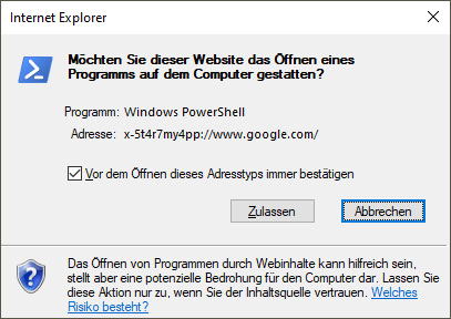 To start the Microsoft Edge browser, you can use the URI Microsoft Edge followed by the address bar, e.g. microsoft-edge:https://www.google.com. You then do not need any further steps in the procedure, as this is an integral part of Windows.