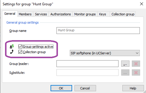 Example screenshot: Groups in UCServer - General - General group settings - Active group settings - Collection group