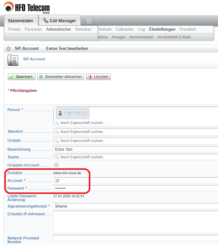 After selecting the Accounts menu, a further menu item SIP Accounts is available, via which the set up SIP accounts are listed. If a SIP account is opened for editing, the information required for setting up the SIP lines in the estos UCServer administration can be determined: