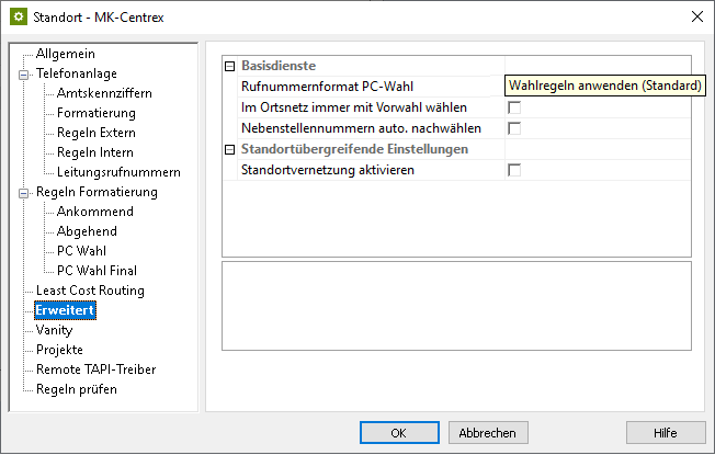 The following rules for exchange code processing and formatting were found to be suitable in the test connections to the MK-Centrex vPBX, but could also deviate from them due to customer-specific connection variants and could require readjustment.