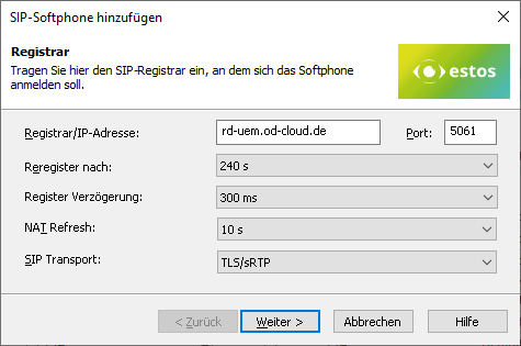 In the input line Registrar/IP address, the registrar and the port information are already preset. Please check this information is correct or enter the correct data for your access here, which you will have received from Ostertag DeTeWe GmbH.: