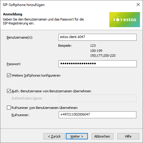 However, additional softphone lines can also be added later or created via file import. - Transfer auth.username from username: activated (always unchecked).
