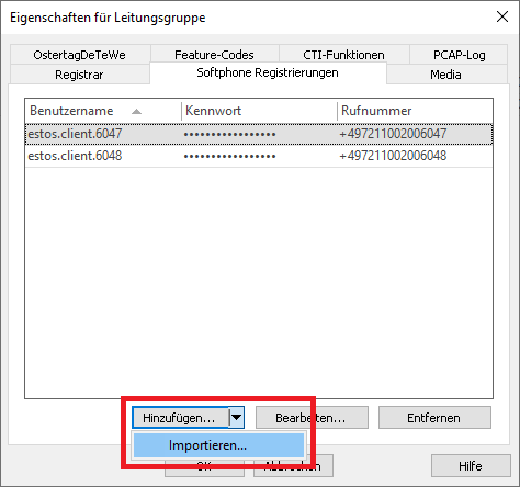 If there is a username entry in the import file that is already included in the list of softphone registrations in the line group, it will be skipped during the import. Even if the optional values to the username would have changed, an already existing username would not be updated regarding its values. An import also cannot be used to delete usernames from the list of softphone lines to be registered. A username that is no longer included in the import file will not cause the username to be deleted from the line group when the import process is repeated. Therefore, if extensive changes are made to existing usernames, it is worth considering whether deleting all of the usernames in the line group and then reimporting them with the corrected data might be more appropriate.