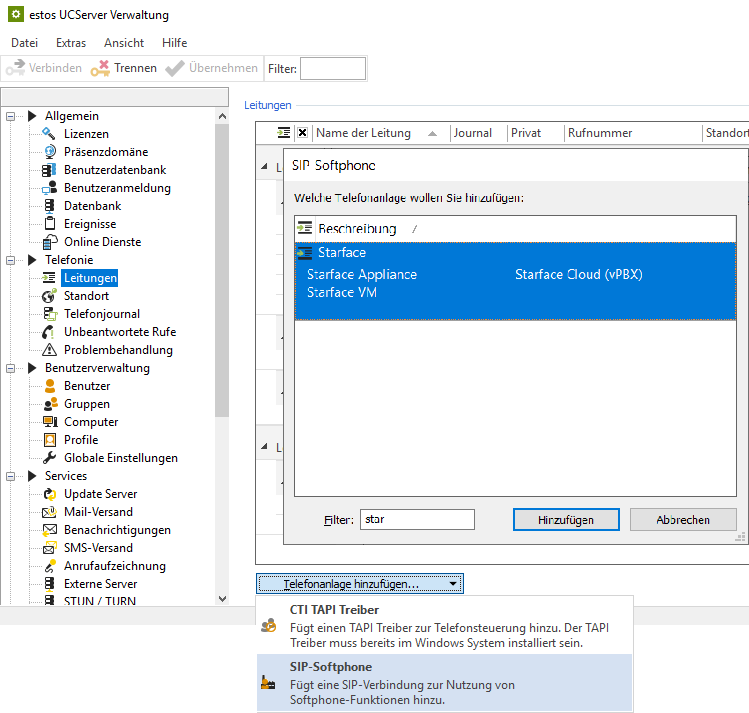 In order for estos ProCall Enterprise to be able to put the SIP lines in the STARFACE Cloud PBX into operation for the softphone functionality, the corresponding devices of the device type Standard Sip have to be configured in the STARFACE Cloud PBX administration or the information about already configured Standard Sip devices has to be read out.