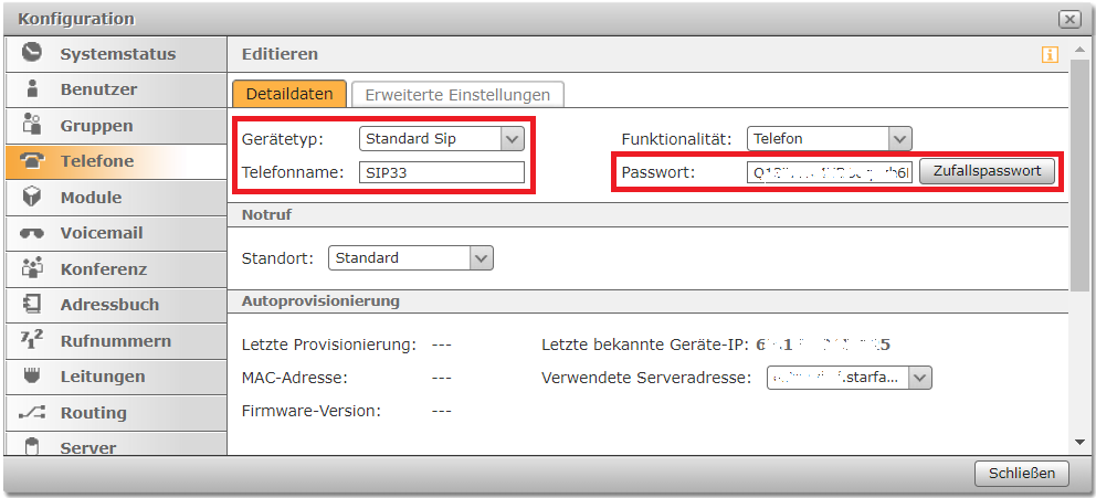Example screenshot: STARFACE configuration – Phones – Detail data – Device type – Phone name – Password