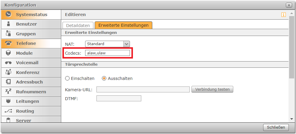 Example screenshot: STARFACE configuration – Phones – Advanced settings – Codecs