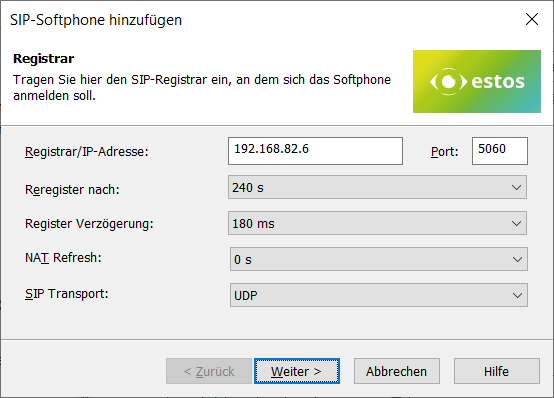 The connection of SIP subscribers to this vPBX, developed, tested and released by estos, requires the UDP selection in the SIP transport setting option.