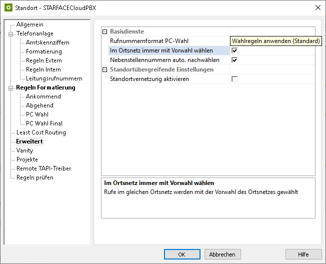 The following rules for exchange code processing and formatting were found to be suitable in the test connections to the STARFACE Cloud PBX, but may deviate from them due to customer-specific connection variants and require readjustment. You can access these setting options directly via the Details button shown above...