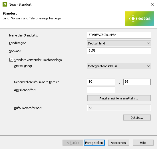 In the estos test environment, a STARFACE Cloud PBX was connected in which the internal phone numbers had two digits throughout, the direct dial numbers to be addressed externally differed from the respective internal phone number on the last two digits, and outside line access codes were not used. In this configuration, a multi-device connection with the option Location uses PBX was selected in the location configuration and the SIP subscriber lines to be registered were entered in the line group with the two-digit internal extension number.