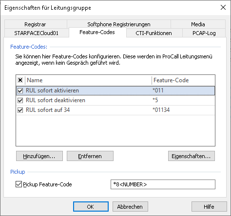 On the Feature codes tab, in the Pickup section, the Pickup feature code must be activated and the vPBX speed dial code for taking over the call for user/group (call grabbing) (*8 internal call number) must be stored.