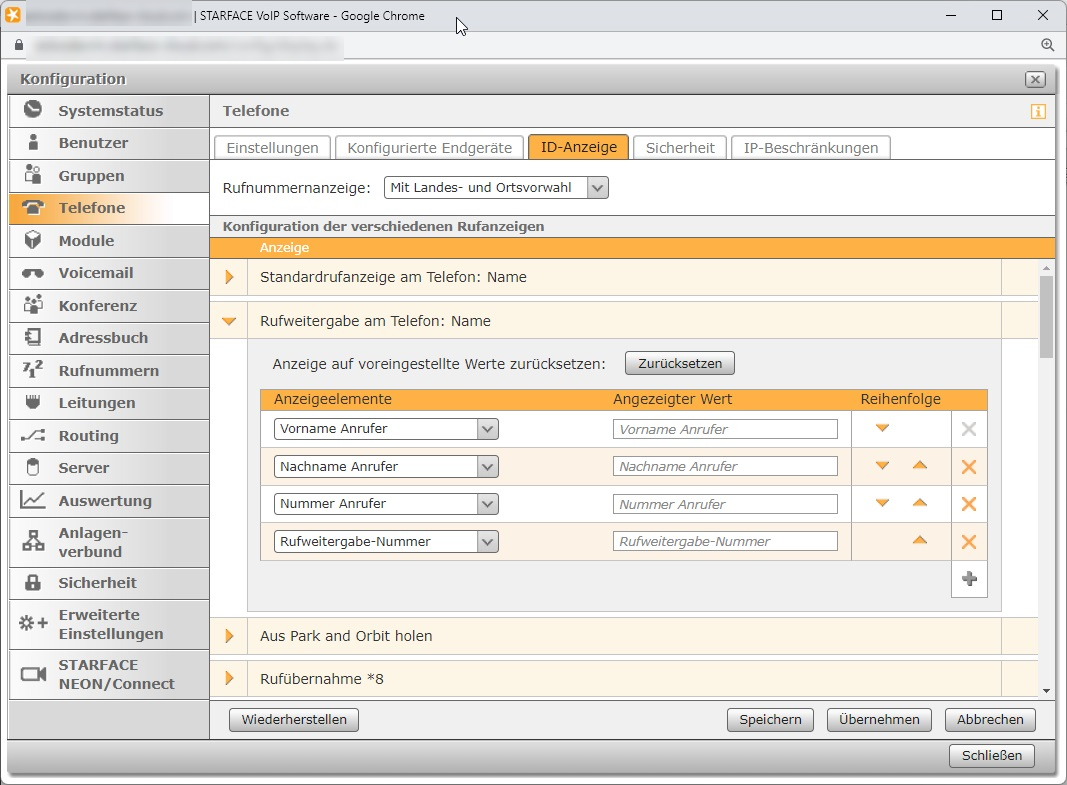 Admin → Phones → ID display → Call forwarding on the phone → Display elements → Call forwarding number