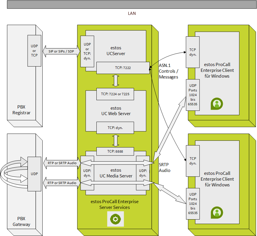 ProCall Enterprise clients connect to ProCall Enterprise server port 7222 (in the installation default) via a dynamically assigned TCP port.