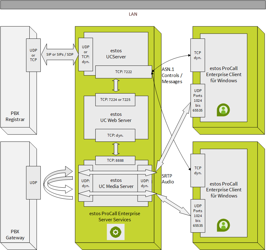 For the exchange of RTP media packets during a SIP call, each client negotiates a direct connection via UDP with the estos UC media server using ICE Handshake (WebRTC standard).