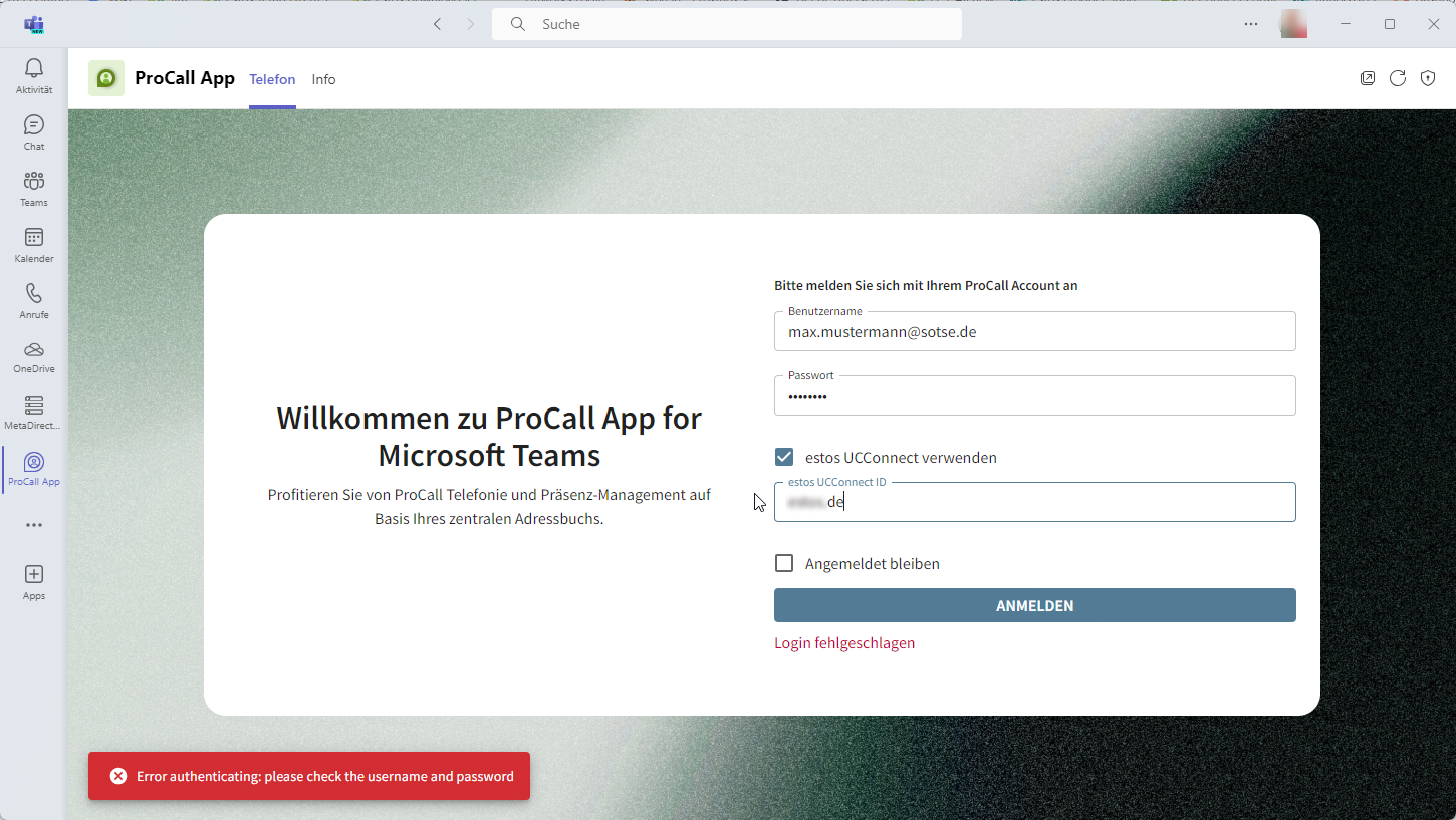 Example screenshot: ProCall app for Microsoft Teams with error message "Login failed" - Error authenticating: please check username and password