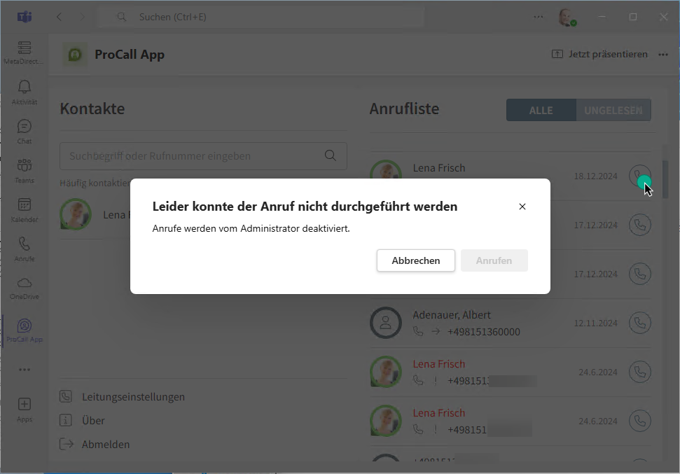 When clicking on the dialling button of the ProCall app for Microsoft Teams, the following message appears: