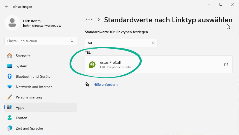 From the ProCall app for Microsoft Teams, the call is initiated via a Tel-URI to which the ProCall client for Windows should respond on the system. The first time the call function was used, the user selected an incorrect application for this tel URI and saved it in the system.