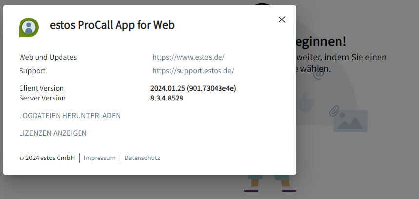Click on your own image in the top left-hand corner to open a menu. In the "About" menu item, you will find the version number for the ProCall app for Web or UCServer and the option to download log files to make them available for analysis purposes.