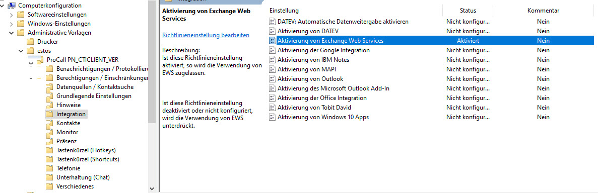 You have the possibility to use the predefined ADM/ADMX templates for the groupware integration of ProCall Enterprise.