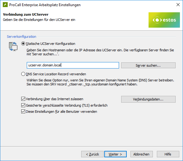 For example, you can set up the user's workstation computer in the company and install the ProCall client for Windows at the same time and login to the UCServer via the conventional direct connection and thereby get the UCConnect parameters automatically stored on the client.