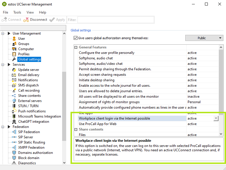 Example screenshot estos UCServer Administration - User administration - Users - Settings for users - Services - General functions - Workplace client login via the Internet possible