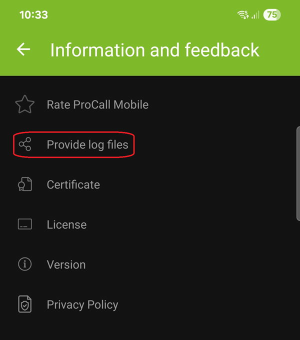 1. In the ProCall Mobile App, go to the "Me" area then "Information and Feedback" and press "Provide log files".
