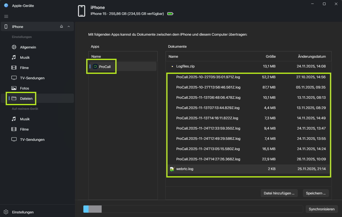 Example screenshot: App Apple devices - Files - App ProCall - Logfiles.zip under Documents
