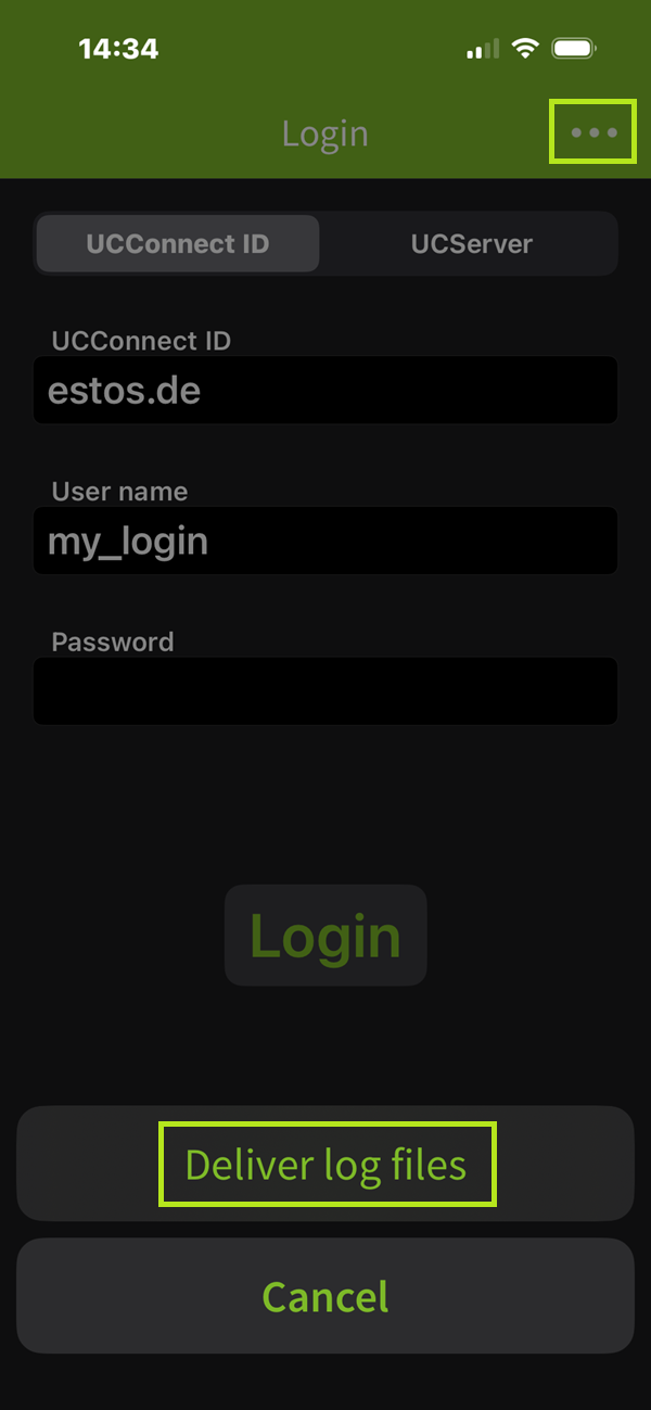 If no login to the UCServer is possible, "Provide log files" can be selected in the login screen via the three dots at the top right in order to create logs. This procedure is possible for both iOS and Android devices.