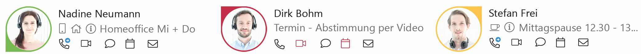 The presence status is formed according to defined rules, e.g. via telephony services, upcoming appointments or it can be set manually. Your contacts see your presence status and your note (depending on the permissions granted).