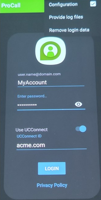 To distinguish between entering a UCConnect ID or a server address and to be able to make the associated entries, select the menu icon in the top right-hand corner of the app title menu
