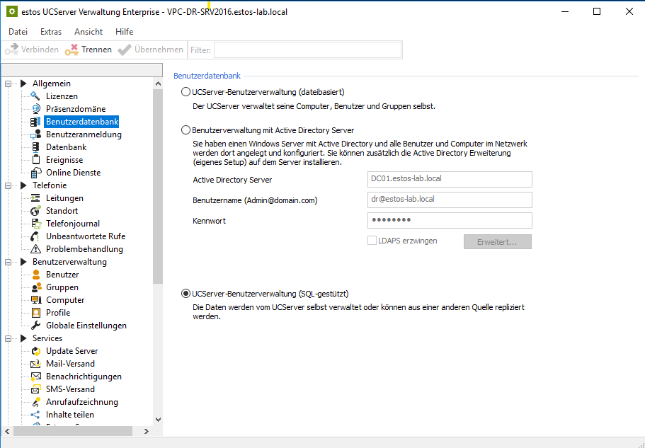 Example screenshot: UCServer Administration – General – User database