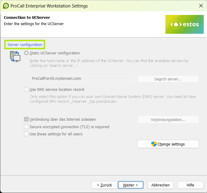 If the ProCall Enterprise workstation settings are started, the configuration page for the connection to the UCServer appears after the language selection.