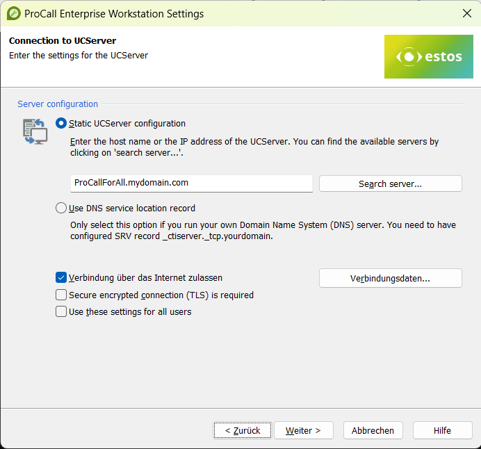 There are various options for defining the ProCall Enterprise server to be addressed in the ProCall Enterprise client configuration: