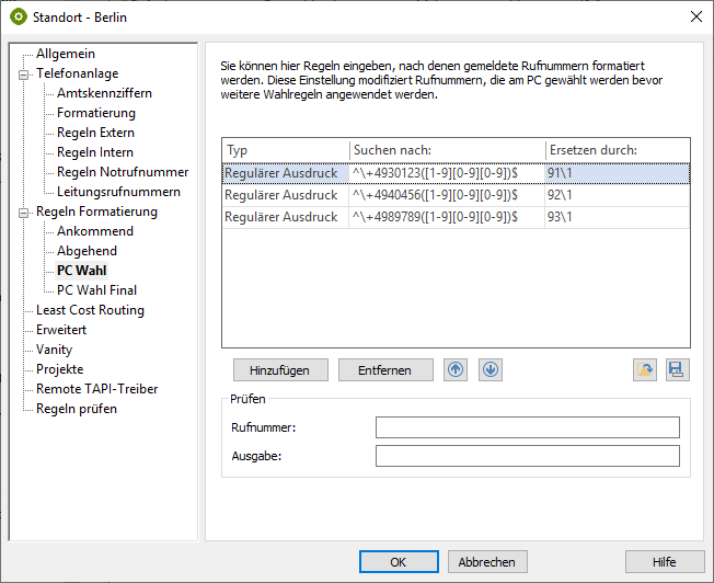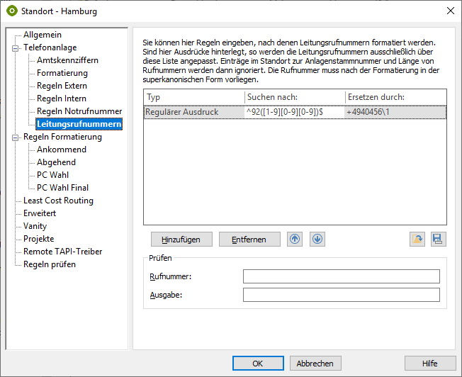 | Regular expression | ^\+4940456([1-9][0-9][0-9])$ | 92\1 | So that colleagues in Hamburg are dialed internally |