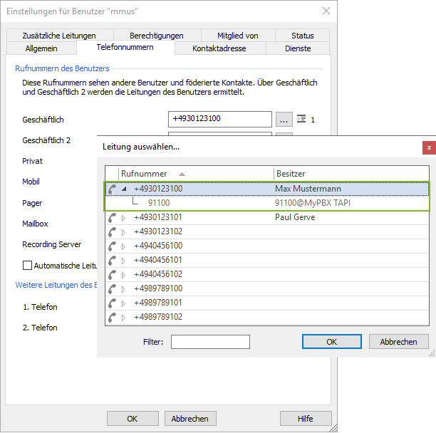 Example screenshot: Settings for users – Phone numbers – Select line – Phone number