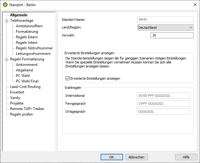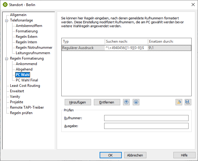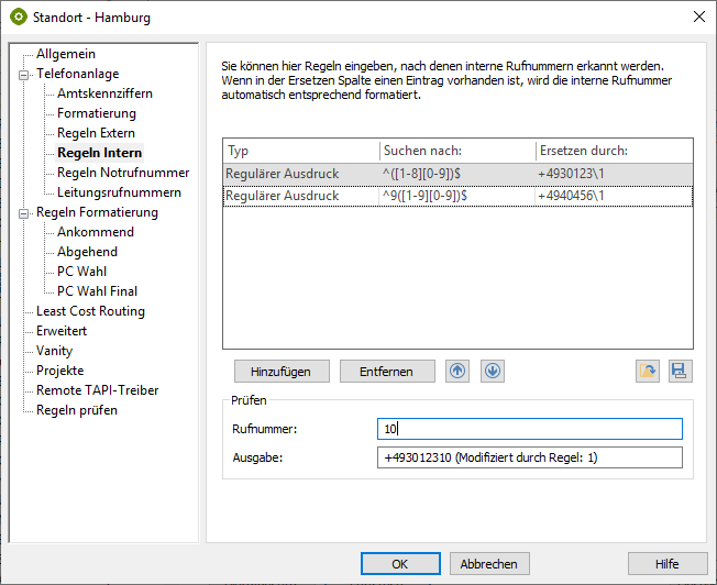 The second RegEx is required in the Hamburg location so that two-digit internal numbers are not supplemented by their own exchange line header, but by the Berlin number: +49 30 123-10