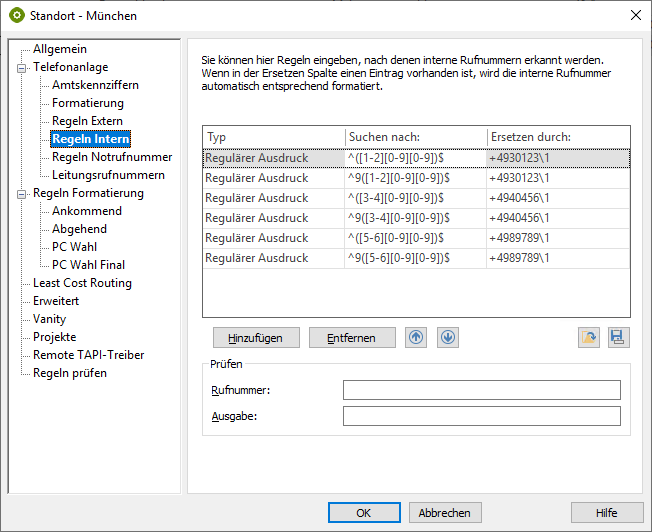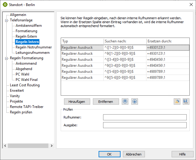 The regular expressions under "Telephone system >> Internal rules" are intended to ensure that the correct E.164 number is determined from the respective internal number. E.g. for the display in the call window.