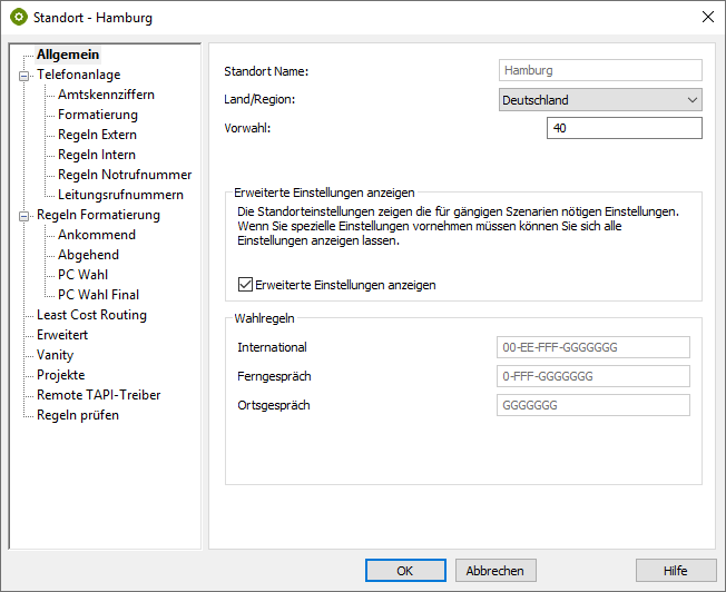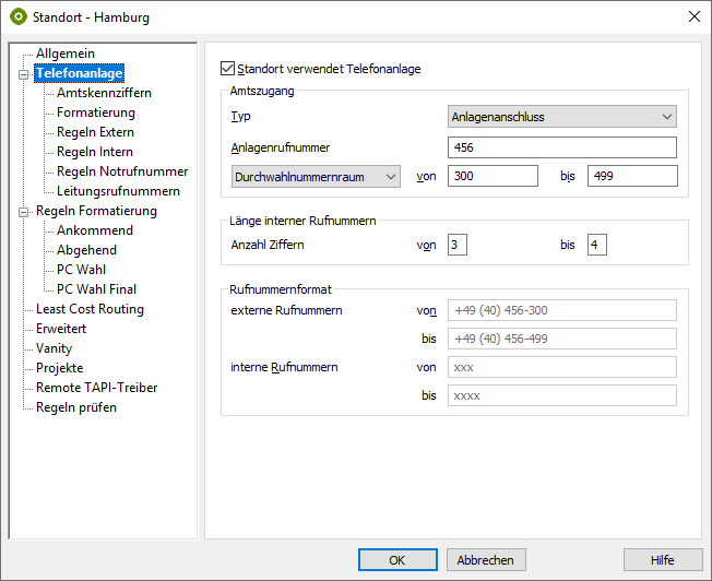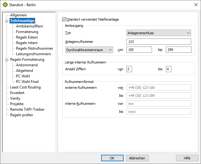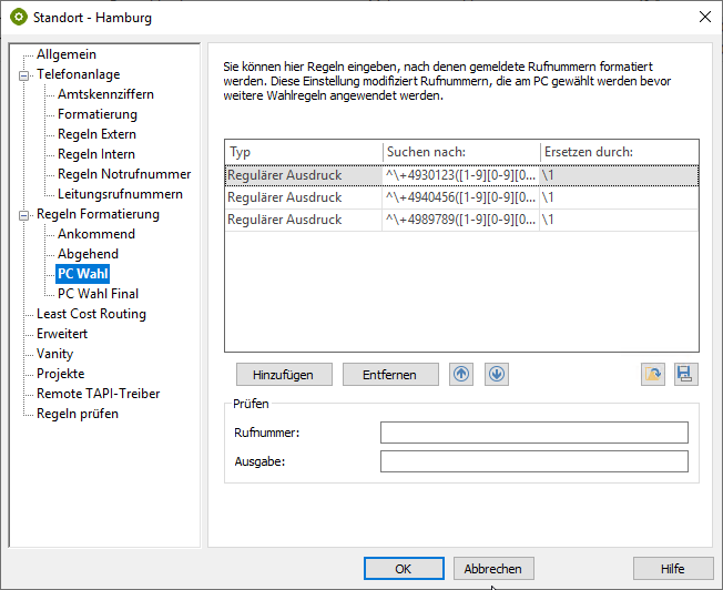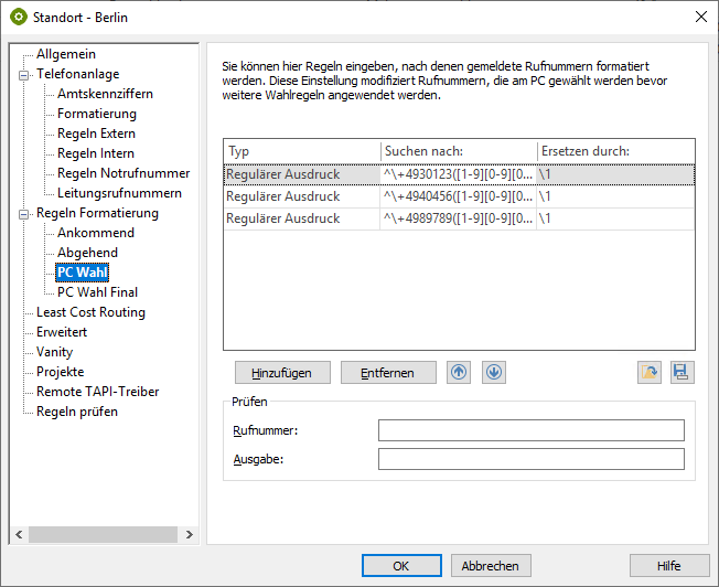 The expressions under "Telephone system >> PC dialing" are intended to ensure that the correct internal telephone number is determined from the respective E.164 telephone number.