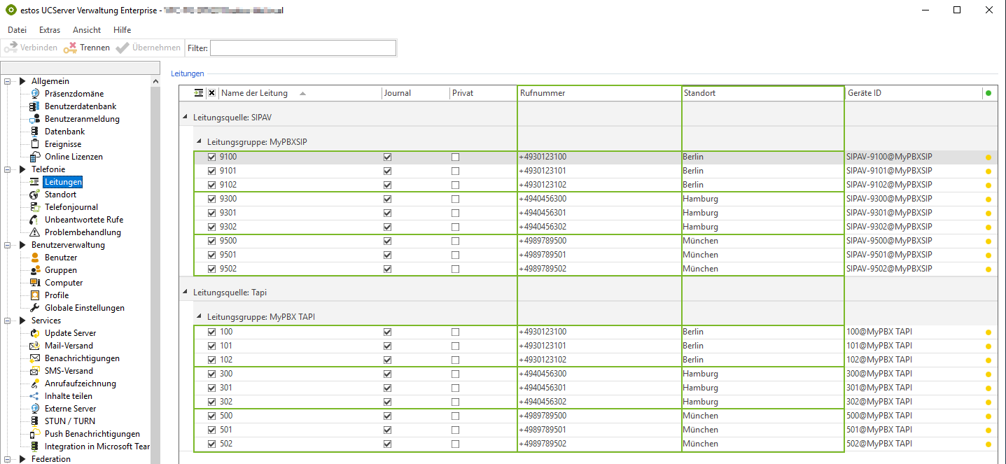 The appropriate rules for formatting must be entered for each location in the UCServer administration under Telephone system → Line numbers using regular expressions.