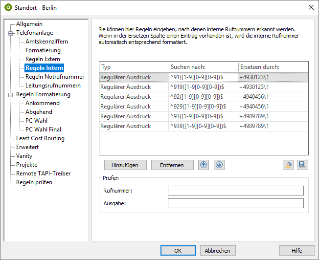 The regular expressions under "Telephone system >> Internal rules" are intended to ensure that the correct E.164 number is determined from the respective internal number. E.g. for the display in the call window.
