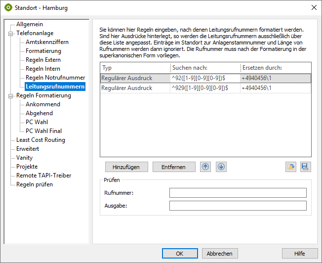 The RegEx in the locations under "Line numbers" automatically recognizes which lines belong to which location, assigns them to the corresponding location and determines the E.164 phone numbers.